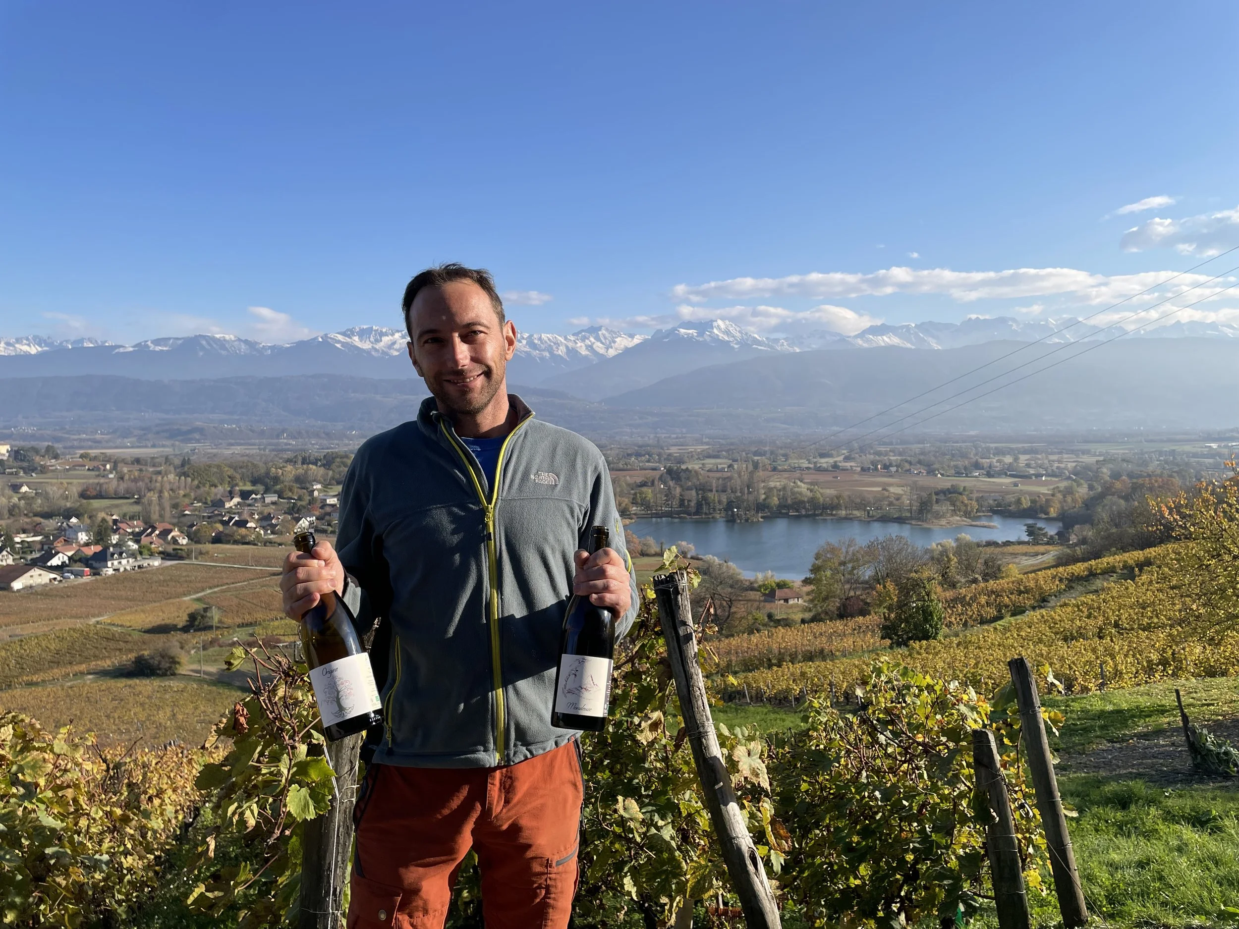 Adrien Dacquin inherited about two hectares of vines from his father and grandfather back in 2012. The vineyard sits on a steep, south-facing slope framed by the Massif des Bauges on one side and the Massif de Chartreuse on the other. It’s honestly one of the most stunning vineyard views I’ve ever seen. The landscape feels as much a part of the wine as the grapes themselves. If you want to dig into the history and geology of the site, Adrien has a detailed write-up on his website which evidences his training as a geographer who, born and raised in Savoie, is deeply invested in how the mountains came to be.